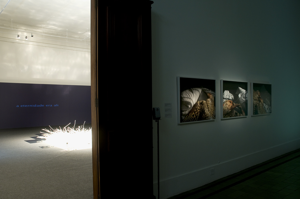 branches, mirrored film floor, original smells (smell of nest, smell of hot sun, smell of wet earth) projection, 6 channel sound design, computer programming. Museu Nacional de Belas Artes, Rio de Janeiro. Photo credit: Bogado.