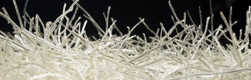 Nidus Vitreo (Glass Nest) is an outcome of a long examination of our need to be sheltered in a moment in history where our sense of home has been shifted by the insecurities brought by ethnic wars, migrations, political divisions but mostly, the state of fragility of our environment. It started with a photograph of a small bird that in the process of building its nest crashed towards its own image reflected on a glass window, perhaps a suicidal bird. It was a search for an essence – a primitive and powerful beginning where the sense of smell is present with its connection to memory. The installation is a large and yet, intimate construction of 1000 branches sculpted with the strength of avian architecture and molded in the fragility of glass resin. The construction takes approximately 160 sq ft floor space covered with a mirrored film skin. The sound & the projected texts from a smell/memory/blog are manipulated algorithmically through a randomized live computer program and sequence and time are never repeated. (http://www.joselycarvalho.net/blog/diaryofsmells)