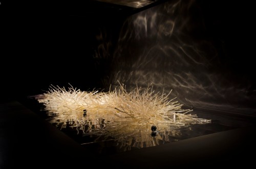 Passages is a sequence in the Diary of Smells: Nidus Vitreo. It is constructed of 1.000 molded glass resin branches in the shape of an abandoned nest. Its memory comes from the original smell of nest dispersed from the sculpture. Sound and projected smell text memories are organized algorithmically in a random manner by a live computer programming. As the visitor leaves the inside space of the installation, 400 empty perfume bottles wait to be filled with personal smell memories.