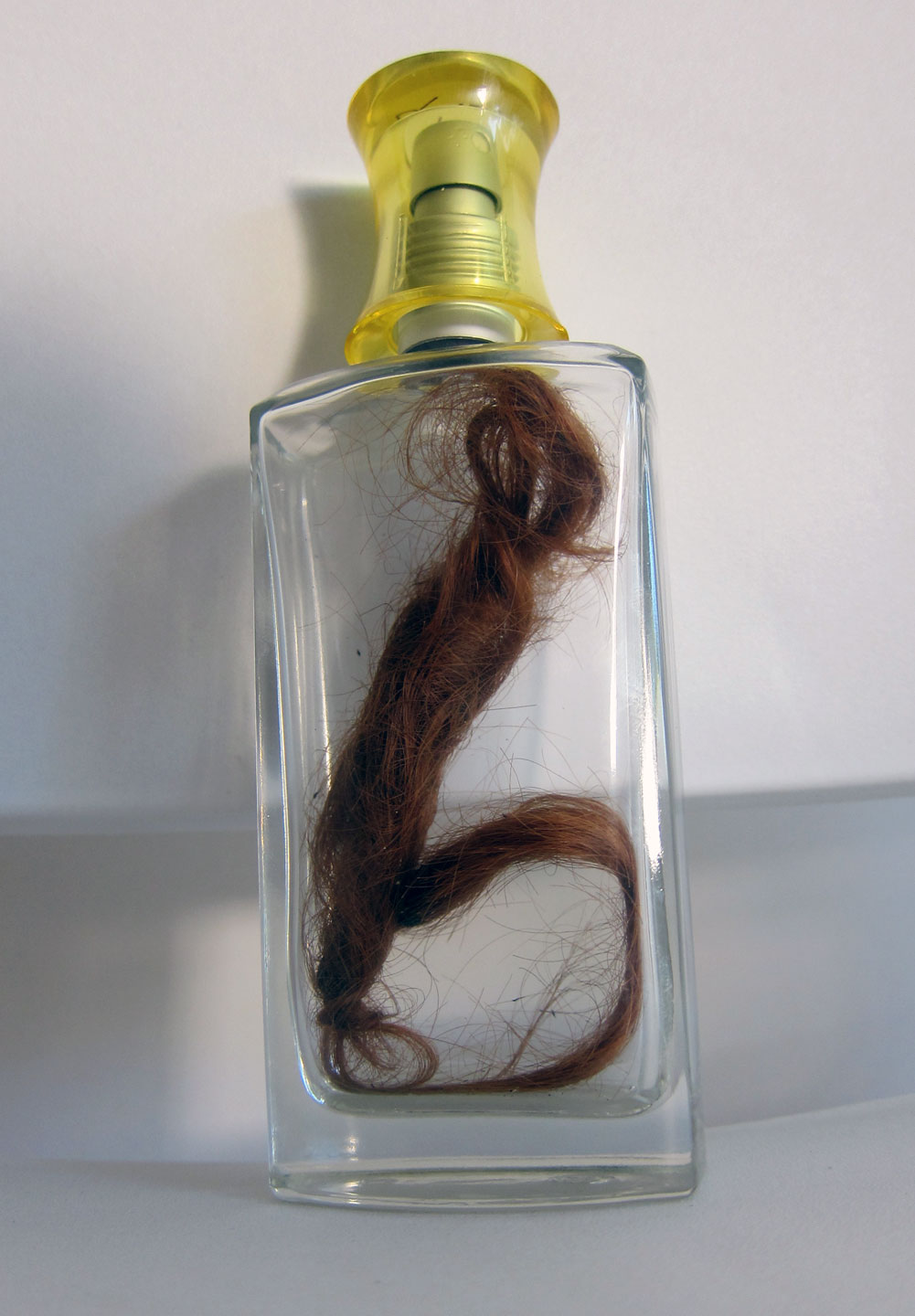 #493. Smell of My Son. This pieces of red hair still keep the smell of chamomile shampoo I used to wash his head. He died at 10 months old. He was born in 1965 and died in 1966. He was exhumed fours years ago. When I saw the remains of his red hair, I took it with me and now I place it inside the perfume flask #493. (Eliza Gonçalves Papa 25/02/2012)